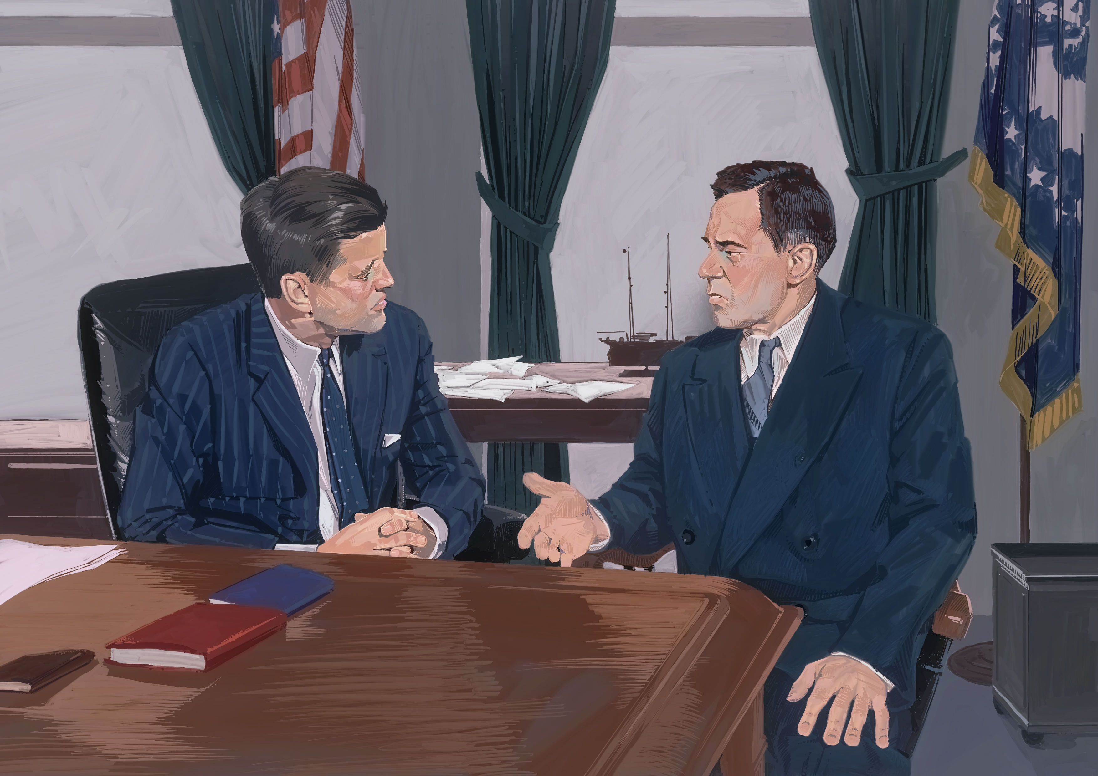 Хотя обстановка была исключительно нервной, Кеннеди не стал сходу громыхать оружием. Да, в его окружении хватало людей, которые предпочли бы сходу устроить «весь мир в труху, и прямо сейчас». Любопытно, что к «ястребам» также не присоединился министр обороны Роберт Макнамара. Макнамара вообще был специфическим министром обороны - во время Второй Мировой войны он служил аналитиком, а большую часть времени входил в топ-менеджмент компании «Форд». Макнамара был сторонником гибкого подхода, не выбирая между отступлением и тотальной войной. Для него Карибский кризис стал настоящим испытанием.